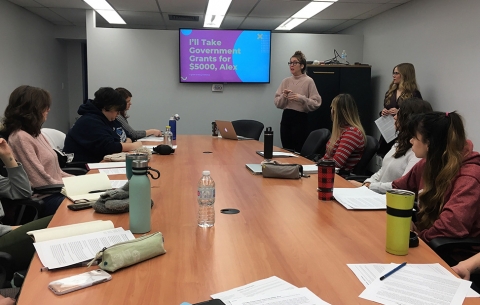 Fine Arts students had the opportunity to visit Creative Industries in downtown North Bay and to learn about grant writing thanks to Nipissing University's Experiential Learning Program for Arts & Science. Jaymie Lathem, Director of Creative Industries, provided students with a comprehensive workshop on grant writing. Students learned what is involved in writing successful grant applications, how to avoid potential pitfalls, and they were introduced to the various granting organizations who fund arts and culture in Ontario, and more broadly in Canada. This experiential learning opportunity provided students with a practical knowledge base and experience with grant writing that will be directly applicable to their future careers working in arts and culture.