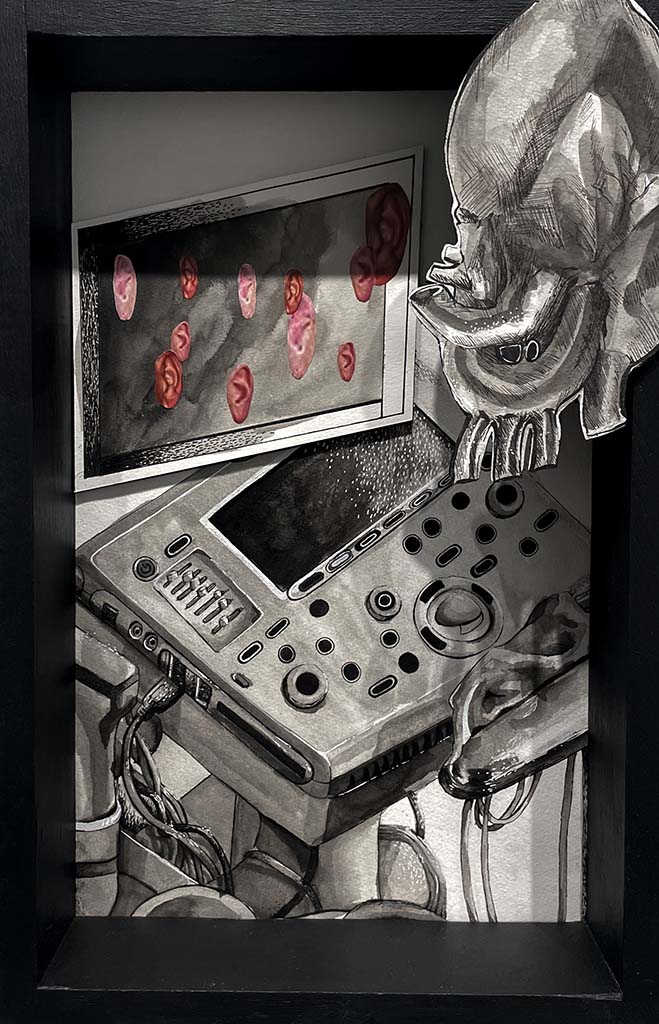 india ink, micron pen, and collage on watercolour paper, 17.5 x 11.5 x 3.5 inches, 2022 -