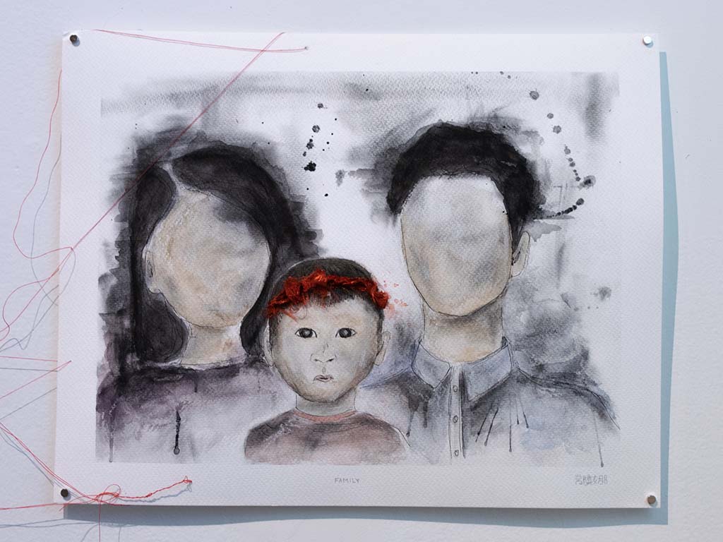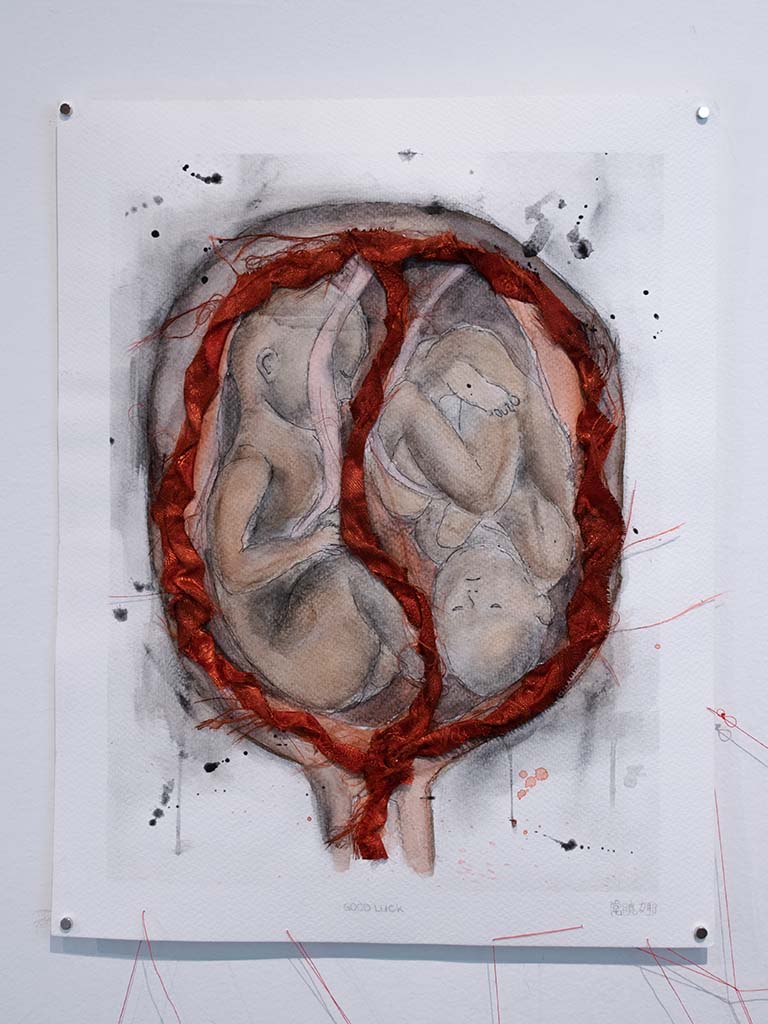 graphite, charcoal, watercolour and silk textiles on paper, 14 x 11 inches, 2022 -