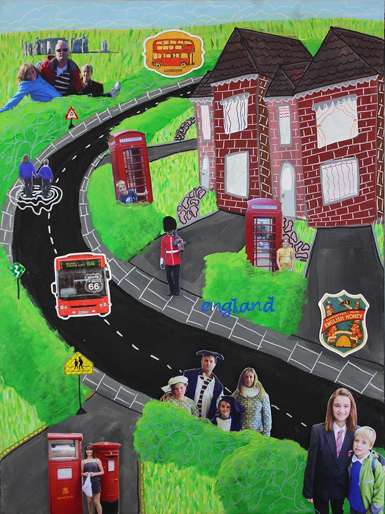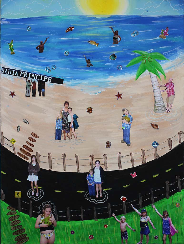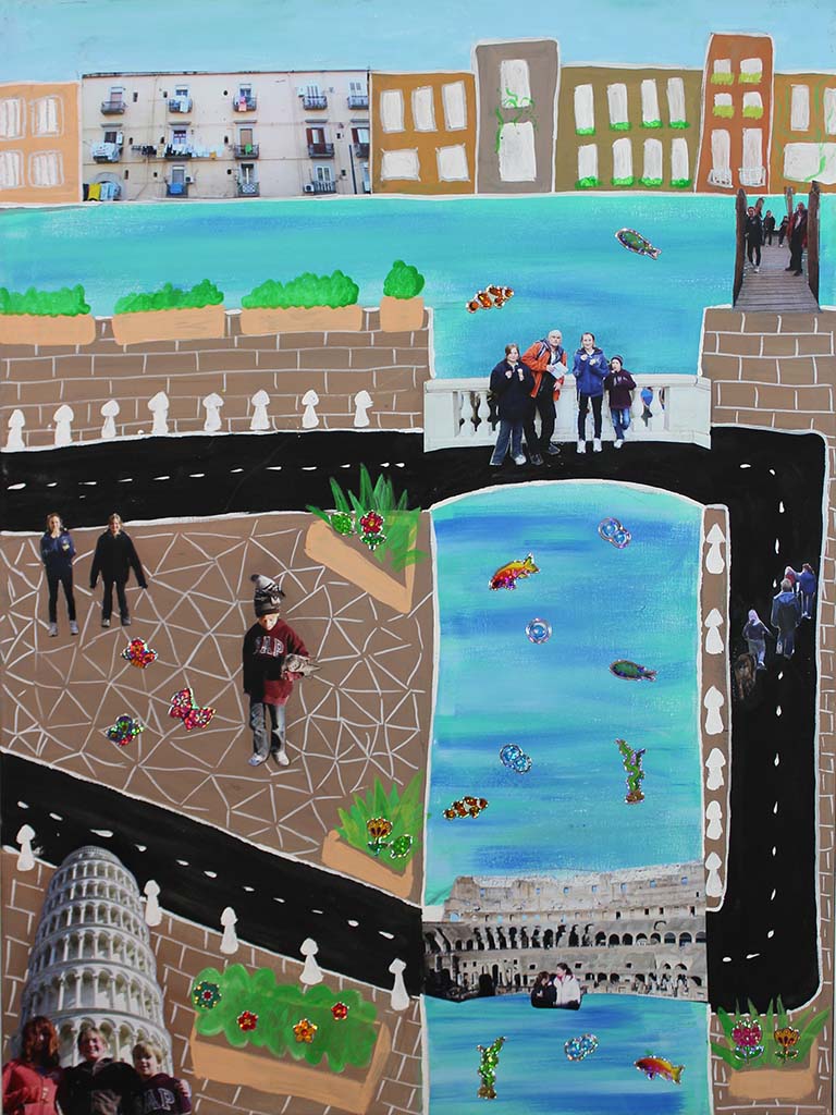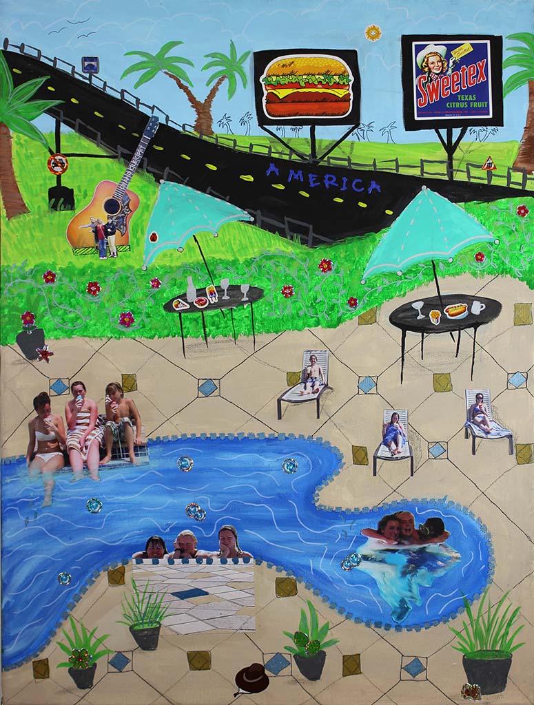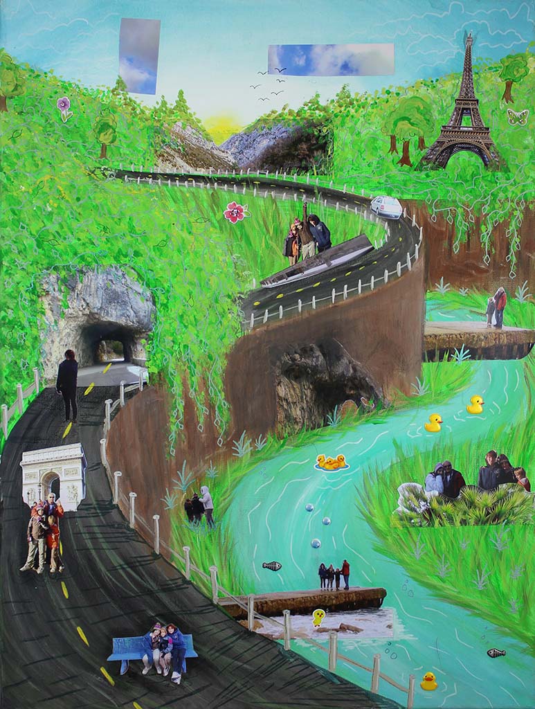 acrylic paint, mixed media, found additions, 18 x 24 inches, 2021 -