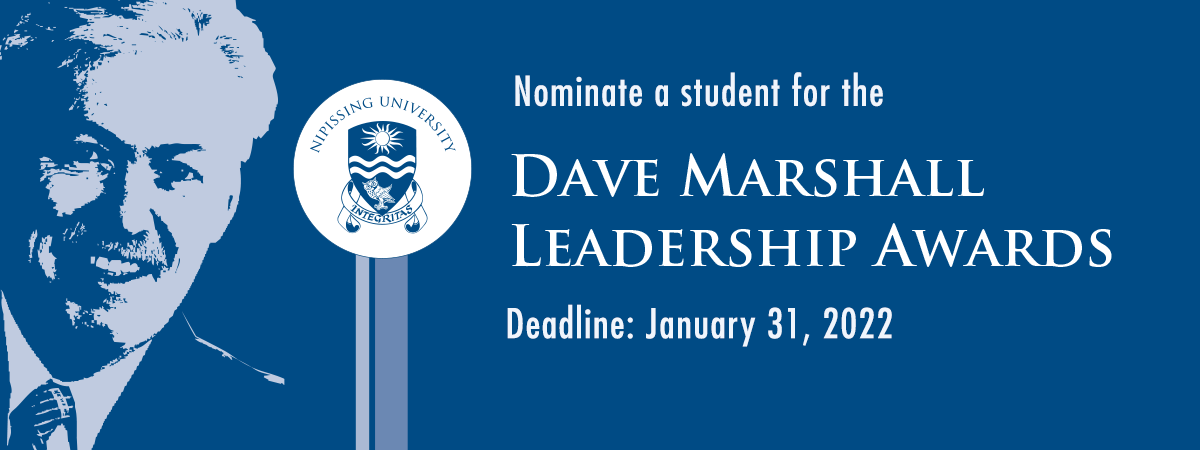 Dave Marshall Leadership AwardDo you know an outstanding Nipissing University student leader deserving of recognition? Nominations for the 2022 Dave Marshall Leadership Awards are officially open. Until January 31, 2022, faculty members, alumni, students and community members are encouraged to nominate individuals who have demonstrated exceptional leadership in one of three categories: Academic, Campus or Community. -